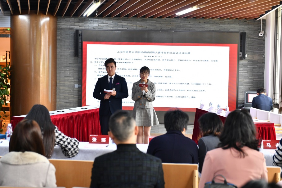11月14日下午,由太阳成集团tyc539就业指导中心主办、太阳成集团tyc539承办的2018年职场模拟招聘大赛复决赛在员工事务与发展中心一楼举行。大赛邀请了上海市第七人民医院人事处处长陈奇,国大药房连锁公司上海分公司职业训练师唐治平,上海名企人力资源服务有限公司副总经理汪飞,广东固生堂中医连锁集团上海大区副总经理厉先国,无锡九如城养老产业集团人力资源副经理王文娟等五位职业生涯规划导师作评委,校学工部、研工部副部长成琳,各二级公司员工工作负责人观摩了本次比赛。来自各公司的20名参赛选手和40余名观赛同学一起出席了比赛。