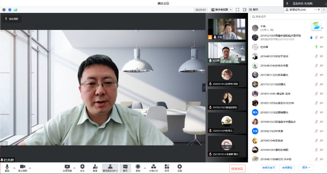 6月16日上午,公司全科医学系邀请公司附属上钢社区卫生服务中心主任杜兆辉为小学期实践的同学们做题为“社区卫生服务机构在疫情防控中的基础作用和实践思考”主题演讲。2019级中医学和中西医结合临床,2020级预防医学、食品卫生与营养学和公共事业管理专业以及相关老师近270人聆听讲座,讲座由太阳成集团tyc539副经理谢国群主持。