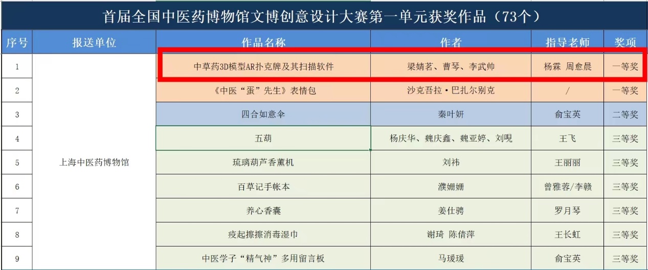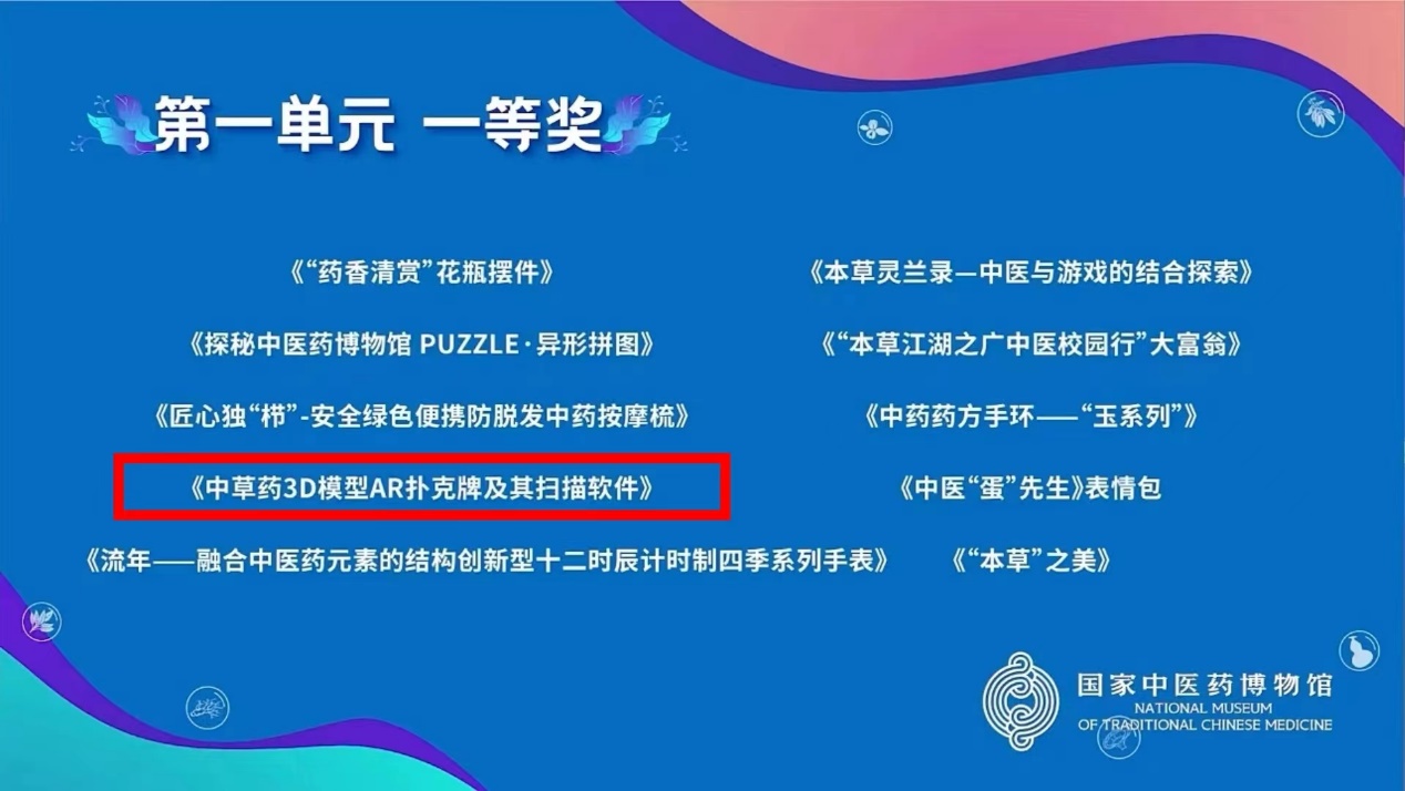 公司员工梁婧茗、曹琴的作品《中草药3D模型AR扑克牌及其扫描软件》在第一单元荣获全国一等奖;在第二单元多校合作团队创作中,由上海中医药博物馆张宇奇指导、公司梁婧茗、曹琴作为核心成员的道生队,作品《大师耀茶系列外包装》荣获冠军!