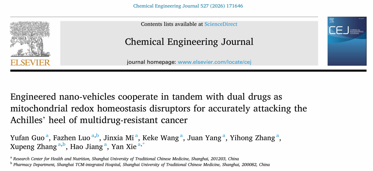 近日,健康营养研究室谢燕团队在国际学术期刊Chemical Engineering Journal发表了题为“Engineered nano-vehicles cooperate in tandem with dual drugs as mitochondrial redox homeostasis disruptors for accurately attacking the Achilles’ heel of multidrug-resistant cancer”的研究性论文。该研究成功构建了一种紫杉醇/熊果酸共载型聚合物胶束,通过干扰线粒体氧化还原稳态促进耐药肿瘤细胞氧化应激死亡,从而提高耐药乳腺癌治疗效率,为开发中药活性成分多元化递药系统提供研究积累与案例参考。