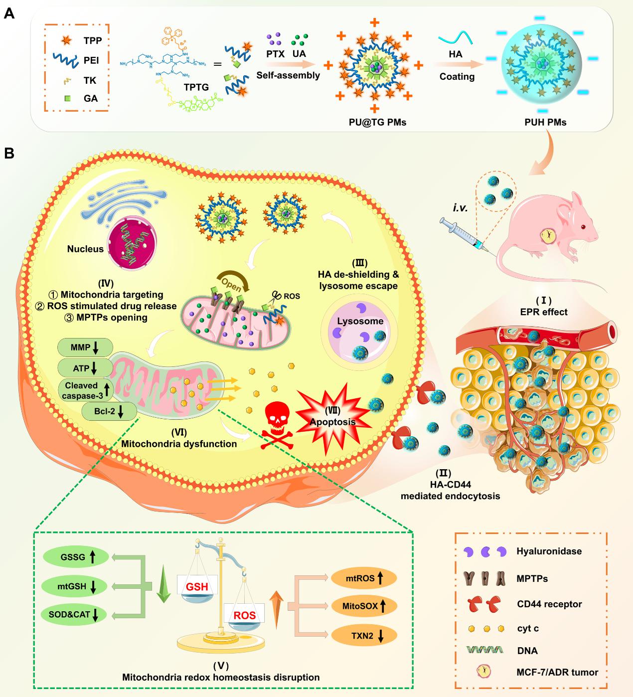 肿瘤耐药性问题是制约化疗成功的一大难题。直接攻击线粒体氧化还原稳态能够促使肿瘤细胞降低对化疗药物的自我耐受阈值,有望缓解肿瘤耐药的进展。研究团队所设计的活性氧和透明质酸酶双敏感的聚合物载体,能穿越层层递送屏障(延长血液循环时间、促进细胞摄取、逃逸溶酶体降解等),将紫杉醇和熊果酸精准共递送至线粒体区域,通过同时促进活性氧的生成和抗氧化防御系统的失活,造成耐药乳腺癌细胞严重的氧化损伤、加重线粒体功能障碍,启动不可逆的细胞凋亡。该紫杉醇/熊果酸共载纳米胶束表现出较强的体内抗肿瘤作用,其抑瘤率达71.22%,且生物安全性良好。